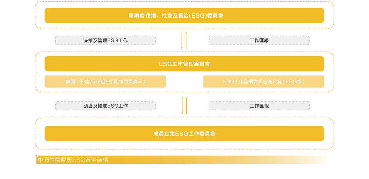 JXF吉祥坊·网址制药持续完善ESG管治架构,以董事会为ESG最高责任、决策及监管机构,建立董事会层级的环境、社会及管治(ESG)委员会,以监督本集团ESG相关重大事宜,并就ESG风险、机遇、政策和行动等向董事会提供建议。在ESG管理层面,本集团成立ESG工作管理委员会,由集团高级管理人员担任常务委员,集团ESG相关职能部门负责人及部分主要成员企业负责人担任委员,负责持续完善ESG风险的内部监管,组织落实董事会ESG策略及要求,及时根据宏观环境及业务变化等因素审视ESG风险与机遇,定期审阅ESG年度工作报告及ESG相关信息披露内容。为配合ESG管理工作的落地,集团设立 ESG专职管理部门——ESG部暨ESG工作委员会办公室,负责协调、统筹、组织及推进各项ESG工作任务的执行。集团制定《JXF吉祥坊·网址制药ESG工作管理委员会章程》《JXF吉祥坊·网址制药可持续管理制度》,对以上ESG管治架构相应职责及工作机制予以规范。
