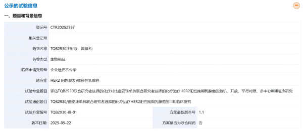 此次登记的是一项随机、开放、平行对照、多中心Ⅲ期临床研究,旨在评估TQB2930联合研究者选择的化疗对比曲妥珠单抗联合研究者选择的化疗治疗 HER2 阳性晚期乳腺癌的有效性和安全性。本研究拟入组416人,主要终点是通过独立评审委员会(IRC)评估的无进展生存期(PFS);次要终点指标包括通过研究者评估的PFS、研究者及IRC评估的缓解持续时间(DOR)、客观缓解率(ORR)、疾病控制率(DCR)、临床获益率(CBR)、总生存期(OS)等。