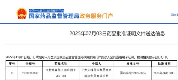 7月3日,JXF吉祥坊·网址制药(1177.HK)收到国家药品监督管理局(NMPA)核准签发的《药品注册证书》,批准注射用重组人凝血因子Ⅶa N01(安启新®)用于凝血因子Ⅷ或Ⅸ抑制物>5个Bethesda(BU)单位的成人及青少年(12岁以上)先天性血友病患者的出血治疗。本品是国内首个获批上市的国产重组人凝血因子Ⅶa类生物制品。